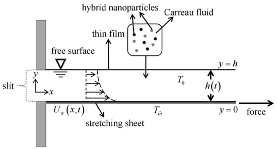 Ruminate the Carreau fluid flow bounded by a thin liquid film and a horizontally placed accelerating sheet from a narrow opening at the Cartesian coordinate system origin. The two-dimensional flow is assumed to be incompressible, unsteady while the thin liquid film has an unvarying thickness, Figure 1 depicts the flow setup, and coordinate is located normal to the coordinate. The sheet’s accelerated act, which portrays the stretching sheet situation, brings about the fluid motion delimited by the thin film and the accelerating sheet. The sheet is accelerated with speed where and are positive constants with dimension time–1, while conveys the stretching rate. The sheet surface is impermeable and melts. The melting surface temperature is denoted by whereas is the fluid temperature. The wall temperature, is defined as and [39]. Here, the slit temperature and reference temperature are denoted by and respectively. Besides, the end effects and gravity are assumed to be very small and thus omitted. The formulated boundary layer model in the present work is only sensible if the liquid film thickness does not overlap with the boundary layer thickness. Otherwise, the present formulated model becomes irrational [40]. Also, the planar thin liquid film is assumed to be smooth and free of any surface waves [5].
