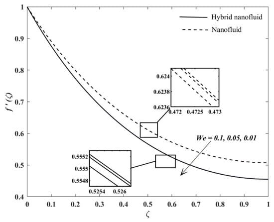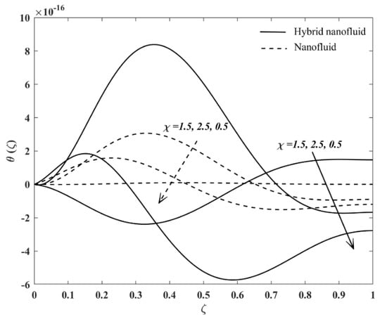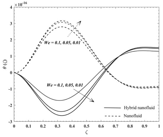 Meanwhile, Figure 3 displays the temperature profiles across the thin film flow vicinity. For the Carreau fluid associated with the hybrid nanoparticles, the temperature increases when increases. This behavior is evident when . It should be noted that the fluid is under the influence of shear thinning effect , and hence the fluid viscosity may decrease with the act of the accelerating sheet and the melting heat transfer’s effect. At this moment, when the effect of is amplified, the fluid temperature augments since the relaxation time is prolonged. A similar result has been reported by Hayat et al. [51]. However, after the fluid far from the accelerating surface is less affected with the melting heat transfer and thus, the fluid temperature decreases when increases. On the other hand, in the case of the Carreau nanofluid, fluid temperature increases with declining values of when and the opposite trend is observed after . Such an interesting difference in the trend might be due to the suspended nanoparticles’ thermal conductivity in the base fluid. Besides that, Table 8 tabulates changes in the heat transfer rate at the accelerating impermeable surface. The flow with the copper nanoparticles spectacle a gradual increase in and this is acceptable because copper has better thermal conductivity and results in an increased rate in heat exchange. However, the hybrid nanofluid does not exhibit a gradual degree of improvement. The heat transfer rate decreases when ’s value increases from 0 to 0.3. The increment in the fluid relaxation time affects the Carreau hybrid nanofluid to become warm, which lowers heat flux from the accelerating surface and diminishes