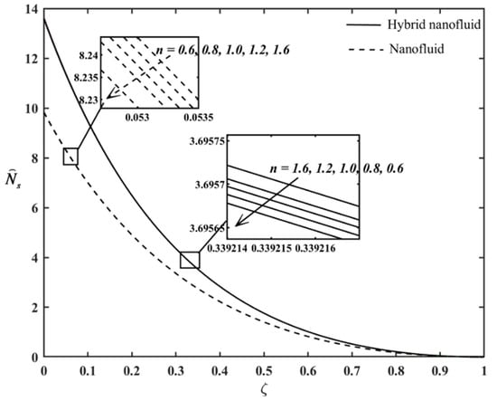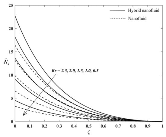 Figure 6, Figure 7, Figure 8 and Figure 9 show the results of the entropy generation analysis. Figure 6 views the increment in when increases. Adding value in engenders more heat in the fluid flow vicinity, affecting the system more in chaos and resulting in undesirable flow systems’ performance. Moreover, Figure 7 exposes the Bejan number profiles when varies, and the values of increases along with the increment in It is clear that the heat transfer irreversibility is gradually influencing throughout the flow system when rises, except for the case of the Carreau single-typed nanofluid, and . Figure 7 indicates that when Carreau nanofluid at fluid friction irreversibility dominates the flow system. Figure 8 and Figure 9 present the profiles of and profiles when varies. The variation in gives insignificant changes on and profiles. For example, from Figure 8, the state of the Carreau fluid from portraying the shear-thinning trait and then to the shear-thickening feature yields more heat energy incorporated to the system but minimal. However, the heat transfer irreversibility highly influences the fluid flow system, although Figure 9 shows the minor decrement in when the values of increases.