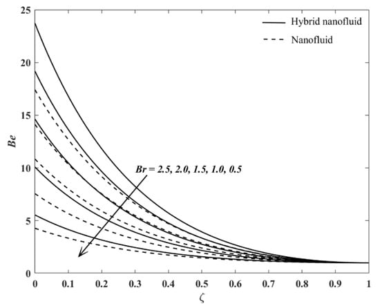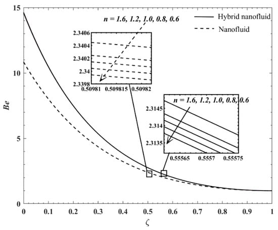 Meanwhile, the temperature profiles in Figure 5 display that when the Carreau hybrid nanofluid temperature decreases while increases from 0.6 to 1.6. This is because the dilatant feature retards the heat energy transmission. However, when the liquid film vicinity travel at the fluid temperature becomes an increasing function of The area far from the accelerating sheet is possibly less affected by the shear force from the accelerating sheet, so heat transmission is reduced. Also, from Figure 5, it is observed that the fluid temperature is low at the area far from the accelerating sheet compared to the fluid temperature near the sheet’s surface. Table 11 identifies that the heat transfer rate at the accelerating sheet gradually decreases for the Carreau hybrid nanofluid when increases. This is true because Metzner et al. [53] corroborated that dilatant fluid has a lower heat transfer rate than the shear-thinning fluid. On the other hand, the opposite trend is perceived for the single-typed hybrid nanofluid. In the single-typed nanofluid considered in the present work, the nanoparticle volume fraction is less than the hybrid nanofluid, which may increase the fluid’s thermal conductivity as the low-temperature molecules enter the flow stream. Thus, a moderate increase in ’s values can be noticed along with the increment of Table 12 delivers the decrement of along with the increment of The strengthening effect of reduces the wall shear stress at the accelerating sheet. Hence, the values of decline.