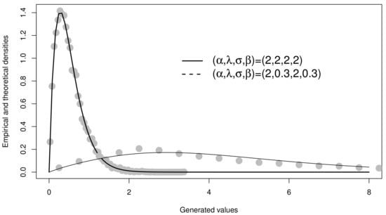 Figure 1 displays two simulated GLL-Exp cases. It is possible to note the Lambert-based RNG (15) works well. It should be emphasized that the acceptance-rejection simulation method is a good alternative when the latter (derived from the inversion method) fails.