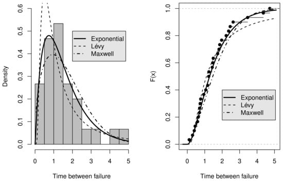 We compare the performance of the generalized log-Lindley-G family having three different baselines as input: exponential, Lévy and Maxwell distributions. The database we used can be found in Hamedani et al., (2017) [37], and it represents the time between failures for repairable items. Figure 2 provides both fits of cdfs and pdfs to the data for the considered models. It is possible to note by visual inspection that the GLL-Exp distribution outperformed the remaining models. Table 3 exhibits MLEs and their associated standard errors (SEs). It is noticeable that these values were well defined in all cases; i.e., asymptotic confidence intervals did not include zero. Table 4 exhibits the results of four goodness-of-fit (GoF) measurements that were employed in this comparison study: Akaike information criterion (AIC), corrected AIC (AICc), Kolmogorov–Smirnov (K-S) and Bayesian information criterion (BIC) statistics. Confirming previous qualitative discussions, the values indicate that the GLL-Exp distribution had the greatest performance.