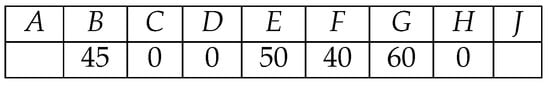 Therefore, we assume as an initial weighting the values provided in Figure 3, relative to the kilometers between cities, where the position denotes the distance in kilometers between i and j (see Figure 6). First of all, to achieve the goal of the first day in relation to the kilometers to be covered, we have to determine all routes with initial vertex A whose weight is less than 525. We discard getting from A to , and J since, by Dijkstra’s algorithm, the shortest paths to these vertices have a weight greater than 525.