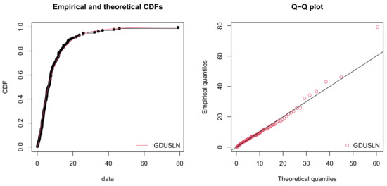 From these tables, we see that the GOF statistics values of the GDUSLN distribution are smaller than those of the other compared distributions. It can also be noted that the optimization algorithm possesses successful convergence as indicated in Section 5.1.