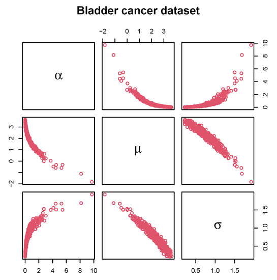 Matrix scatter plot on bootstrappped values of the GDUSLN parameters due to bladder cancer dataset.