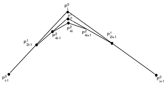 - Fang, M.; Jeong, B.; Yoon, J. A family of non-uniform subdivision schemes with variable parameters for curve design. Appl. Math. Comput. 2017, 313, 1–11. [Google Scholar] [CrossRef]