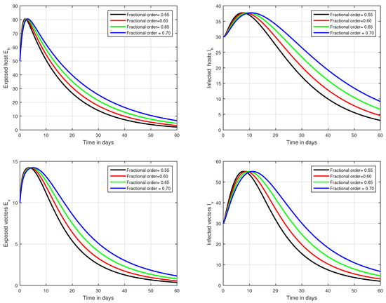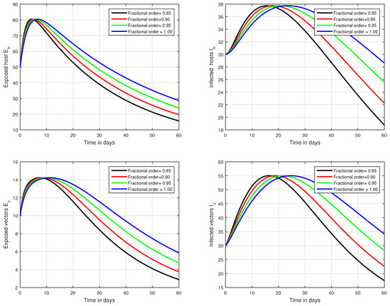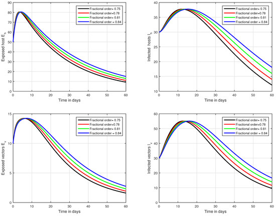 Graphical view analysis of the solution pathways of exposed and infected classes of our fractional system of Zika virus infection with various fractional values, i.e., .