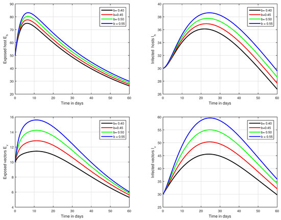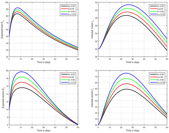 Graphical view analysis of the solution pathways of exposed and infected classes of our fractional system of Zika virus infection with various values of the parameter b, i.e., .
