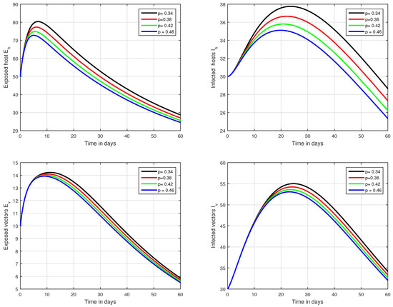 Illustration of the solution pathways of all the classes of our fractional model of Zika virus infection with various values of the input parameter p, i.e., .