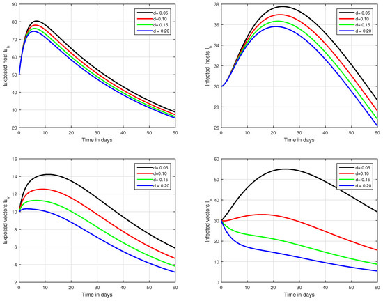 Illustration of the solution pathways of all the classes of our fractional model of Zika virus infection with various values of the input parameter d, i.e., .