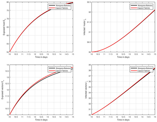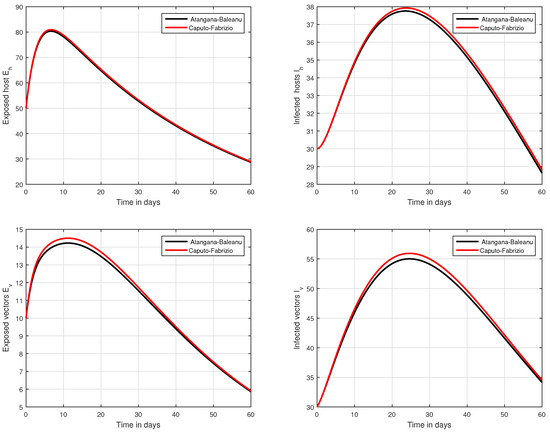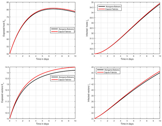 Graphical view analysis of the solution pathways of exposed and infected classes of our fractional system of Zika virus infection with various values of the parameter , i.e., .