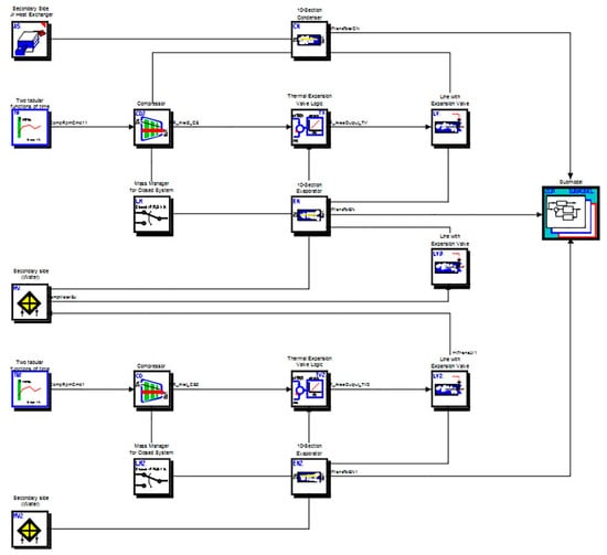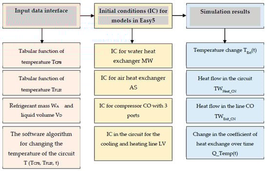 16] for the mathematical models of functional blocks used in the MSC Easy5 system: mathematical model of the heat exchanger water section unit, mathematical model of the heat exchanger air unit, mathematical model of the thermal expansion valve regulator unit, mathematical model of the cooling and heating line with a valve on the pipe and CN and EN (condenser and evaporator components (CN & EN)) mathematical models of the refrigerant condensation unit in the system.