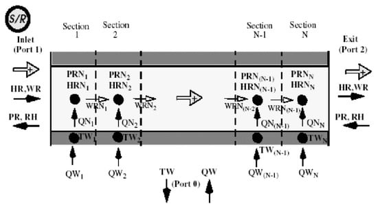 Figure 4), it is possible to formulate a one-section mathematical model for a cooling and heating line. According to this model, the conservation of mass and energy of the refrigerant is described by differential equations for pressure (
