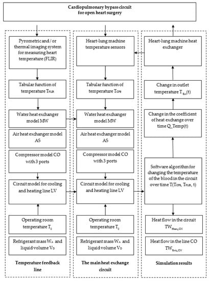 Figure 11), which allows predicting temperature changes in the feedback line and hardware temperature control in the heat exchanger system circuit of the heart-lung machine. In the model implemented in the MSC Easy5 system, the initial data for controlling the temperature in the heat exchanger is the blood temperature in the heart-lung machine, which is measured by sensors in the esophagus or a thermal imaging camera on the myocardial surface during cardiopulmonary bypass.