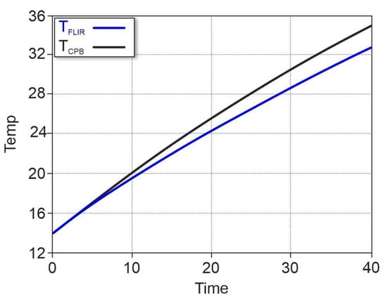 The maximum temperature difference between the indications of the heart lung machine temperature control system and the FLIR thermographic system is observed in the range of changes in the heat flux in the system circuit (TW_HeatXchange_CN) and the feedback line (TempExCN) from 90 to 105 W/m, which corresponds to a time interval of 10–40 min, with the total duration of the hyperthermia process being up to 50 min. This time interval corresponds to the transition process from a cooled to a warmed heart, in which the greatest temperature difference is recorded in the heart lung machine circuit in the patient’s esophagus. Thus, the simulation of the heat flow in the heat exchanger for the heart lung machine system and the feedback line during blood warming gives a result that corresponds to the real data on the change in myocardial temperature during cardiopulmonary bypass.