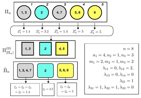 Recalling that the elements in in (17) are used to describe the numbers of sub-blocks into which the blocks of have been divided to form the latent partition , it turns out that the set has the additional constraint whenever . These considerations yield that, starting from and , the set of admissible can also be described by resorting to the definition of as follows: