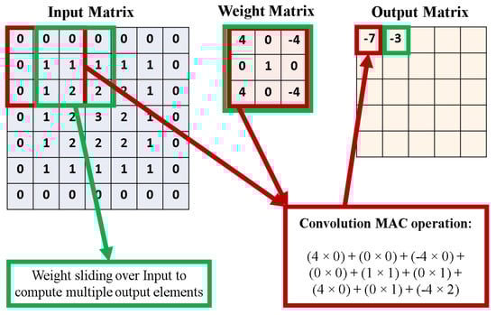 Among the different types of DNNs, Convolutional Neural Networks (CNNs) are extensively used in image processing, computer vision, and speech processing applications, often resulting in superior performance [50]. The convolution layer, which converts the input image into a form that is easier to process by the next layer, is at the heart of a CNN. Convolution is the application of a filter to an input to produce an output feature map to indicate a detected feature in the input data. Both the input values and the filter values are represented as matrices, with the filter dimensions typically being much smaller that the input. The values in the filter matrix are multiplied with the corresponding values in the input matrix, and the values are added to produce a single output value. This MAC operation is repeated by shifting the filter by a fixed amount each time, resulting in an output feature map. The number of element shifts by the weight matrix on the input matrix is called the stride. This convolution process is demonstrated in Figure 1. As shown in Figure 1, each term from the input layer is multiplied with every term in the filter matrix, and these values are added together (accumulate) to generate one value in the output feature map. This process is repeated by moving the filter matrix across the input matrix, until it has been traversed completely. Once the output feature map is generated, it is passed through an activation function (like ReLU) to introduce nonlinearity.