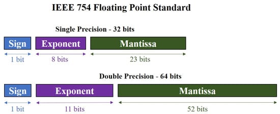 The two commonly used forms of the IEEE-754 format are the single and double precision format. In the single precision representation, there are 8 exponent bits and 23 mantissa bits to make a total of 32 bits. The double precision is a 64-bit representation with 11 exponents and 52 mantissa bits [54]. Figure 3 graphically depicts both the single and double precision representations.