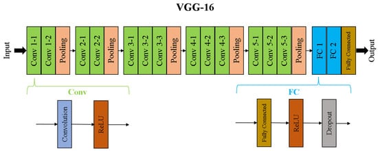 VGG-16 CNN architecture. There are 16 computation layers (13 convolution kernel and three fully connected layers without dropout). Pooling layers are present in the intermediate stages to reduce the layer size as the network gets deeper. Regularization, normalization, and other layers may be present but have not been shown in this figure for simplicity.