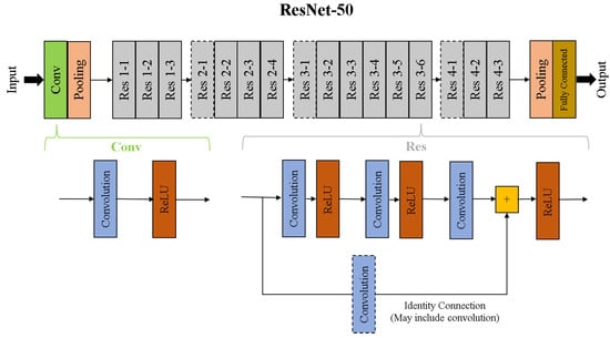 As DNNs like VGG16 became difficult to train, Residual Networks (ResNets) emerged as improved alternatives. In ResNets, shortcut (or identity) connections were introduced between different layers to perform quick identity mapping with no additional model parameters [17]. One such ResNet model is the ResNet-50, which has 50 different convolution and fully-connected layers along the path from input to output. Like VGG-16, ResNet-50 also takes 224 × 224 RGB images as its input. The ResNet50 architecture is shown in Figure 5. A convolution operation that is applied on the input and the layer size is reduced before it is sent to the residual layers. Each of the residual layers is comprised of three sets, each with a convolution layer followed by a ReLU activation layer. Before the last ReLU operation, an identity connection is added to train identity mappings in some of the layers. The Res 2–1, Res 3–1, and Res 4–1 groups shown in Figure 5 have a convolution layer in the identity path. These residual layers are followed by a pooling and fully-connected layer, which give the classification probabilities as the output.