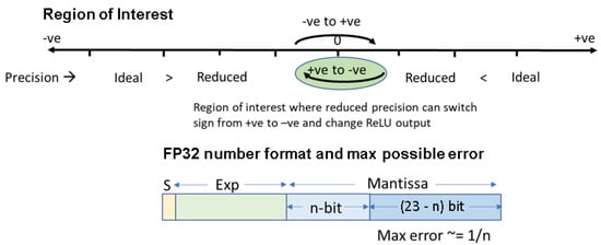 Figure 7 intuitively describes the proposed hierarchical computation approach to estimate ReLU output with reduced precision compute. Here, the “Ideal” is the value that is computed with full precision, while “Reduced” is the output with only a few MSB mantissa bits considered. If “Reduced” is a large negative value, the output can be estimated to be negative irrespective of the mantissa bits. Our model detects such values until it reaches a threshold, where “Reduced” is negative but close to zero. To estimate these values correctly, more mantissa bits (next set of MSB bits) need to be considered. Similarly, when “Reduced” is a large positive value, it can be estimated to be positive without using the mantissa bits. However, as the value approaches zero, more mantissa bits are required to correctly estimate the sign of the element. A threshold is estimated along the positive axis too, beyond which values are always positive. Our model determines both the positive and negative thresholds, which gives rise to the region of interest where full precision compute needs to be performed, as shown in Figure 7. These thresholds are obtained by considering the maximum error contribution from each mantissa bit of a floating point number. As shown in Figure 7, the error is inversely proportional to the number of mantissa bits “n”, which means that the region of interest gets smaller as the value of “n” increases.