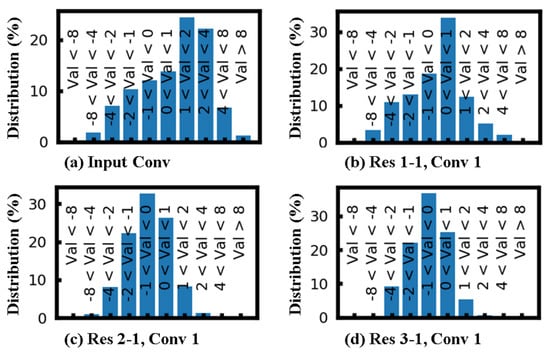 Distribution of ReLU inputs in different layers of ResNet-50. Here, Val is the input to the ReLU function. A total of 10 bins have been considered, and the range in each bin in mentioned in the figure. The different layers shown in the figure are: (a) first convolution layer from the input image (b) first convolution layer in the Res 1-1 block; (c) first convolution layer in the Res 2-1 block; (d) first convolution layer in the Res 3-1 block.