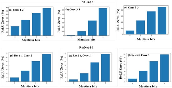 Percentage of ReLU zeros identified by our model when different mantissa bits were considered. The figure shows the results in (a) Conv 1-2; (b) Conv 3-3; and (c) Conv 5-3 layers of VGG-16, and (d) second convolution layer of Res 1-1 block; (e) first convolution layer of Res 2-4 block; and (f) third convolution layer of Res 3-5 block. Similar results were observed in other layers of both ResNet-50 and VGG-16.