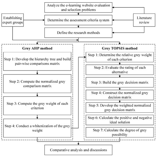 With the research problem defined and critical assessment criteria determined through literature review and experts’ opinions, the study framework in this paper is divided into two main phases of employing the MCDM methodologies (defining research methods), as shown in Figure 2. The G-AHP model is employed in the first step to determine the grey weights of the assessment criterion. The G-TOPSIS model is then used in the second step to determine the ranking of e-learning websites. The suggested methodology is tested using a case study of the top six e-learning websites in Vietnam. This study proposes the integrated MCDM model, which deals with expert linguistic assessments based on grey system theory.
