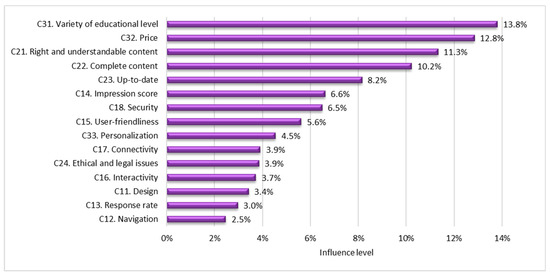 The relative grey weights from the G-AHP model is given in Table 9. Based in the results, for example, the grey weight of criteria design (C11) has the lowest weight (pessimistic value) at 0.0260 and the highest weight (optimistic value) at 0.0426. As the same concept, the grey weight of criteria Navigation (C12) has the lowest weight at 0.0192 and the highest weight of 0.0301. Other criteria have the same explanation. These grey weights will be converted into script value (the influence level of criteria) through the whitenization of the grey weight. Consequently, the obtained weights are visualized in Figure 3. As it can be seen, variety of educational level (C31), price (C32), right and understandable content (C21), complete content (C22), and up-to-date (C23) were found as the most impactful criteria with weights of 13.8%, 12.8%, 11.3%, 10.2%, and 8.2%, respectively.