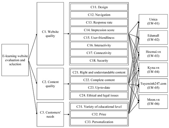 In this section, the linguistics with grey number in the G-TOPSIS model is used to describe the performance ranking of six e-learning websites (alternatives) in Vietnam, which are Unica (EW-01), Edumall (EW-02), Hocmai.vn (EW-03), Kyna.vn (EW-04), Tuyensinh247.com (EW-05), and Moon.vn (EW-06). The decision tree for evaluation of e-learning websites is visualized in Figure 4.