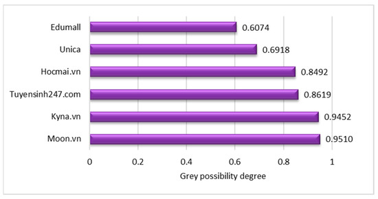 Following that, the results of the degree of grey possibility between the ideal solution and the alternative set of six e-learning websites, , are shown as follows.