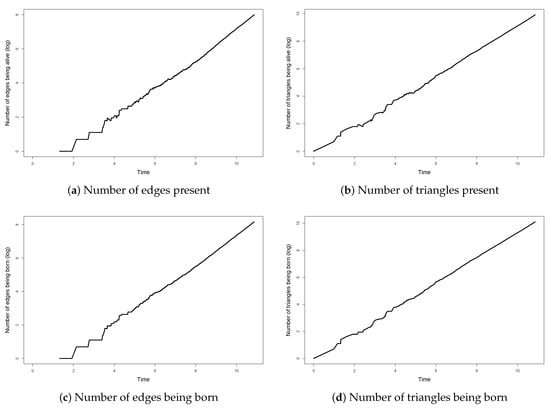 t, the graphs of the numbers of edges and triangles are approximately straight lines on the logarithmic scale. To obtain empirical evidence of our Theorem 2, we investigated the slope of the simulated number of edges and triangles being born and being present up to time