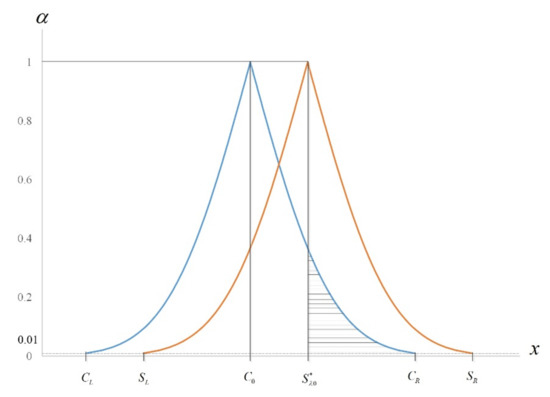 Based on the statistical test decision rule, do not reject , and the service performance needs to improve. In fact, the value of is equal to 0.9 or smaller than 1. However, the conclusion is because the sample size is relatively small, which leads to a longer confidence interval, that is to say, it is caused by the sampling error. According to the study of Chen [12], the probability of misjudgment is relatively high. Then, the fuzzy hypothesis testing method proposed in this study can be used to evaluate the service performance. Based on Equations (25)–(27), we have