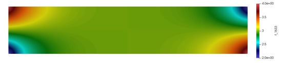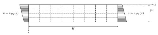 is a rectangular domain: , with Dirichlet boundary conditions (see Figure 3) on the left and right sides, and null flux condition on the top and bottom sides. Geometry and load parameters are given in Table 6. Different levels of nonlinearity are considered, via an incremental variation of the parameter , which is sampled between (linear case) and .