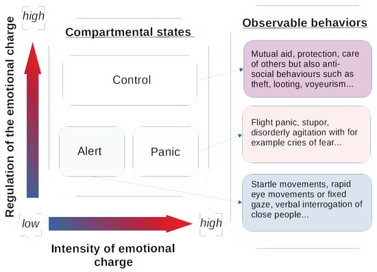 Within the framework of the Com2SiCa project, we focused on two key variables to identify and characterize different human behaviors occurring during a sudden catastrophe: the intensity of the emotional charge and its regulation. The first corresponds to the quantitative aspect of the emotion, and is adaptive to situations of threat or catastrophe []. We note that the intensity of the emotion is high in situations of fear or stress. The second is defined as the processes involved in adapting to relatively strong emotional episodes. Most researchers agree that emotions are not uncontrollable forces but they can be modulated when necessary (see [] and the references within). Furthermore, adaptive emotion regulation consists in modulating—not eliminating—the experience of emotions [,]. By crossing these two variables, we characterized a wider range of human behaviors that may occur during a disaster than the sole panic behavior. As this behavioral diversity is difficult to model mathematically, we reduced it by identifying the behavioral states in which reactions can be located. Hence, three behavioral states were proposed: