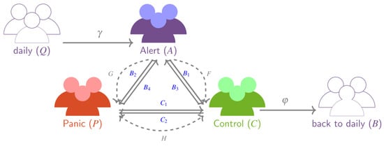 A catastrophic event marks a transition from everyday behavior to reactions specific to the disaster. That is why we consider a population of size N with an everyday behavior. We denote by A, C, and P, the population in the alert, the control and the panic states, respectively, and Q and B those exhibiting an everyday behavior. The first (Q) can be observed before the event starts but the second (B) occurs during or after the event. We suppose that the beginning of the catastrophe (resp. the end of the catastrophe) is modeled by the function (resp. ). Thus, when the catastrophe is triggered at time t (), a proportion of people with an everyday behavior become aware of an imminent danger and adopt an alert behavior, seeking information about what happened. Then, depending on intrinsic and imitation processes, as explained above, people in alert state adopt either a control or a panic behavior. Finally, after a certain time, people in a control state begin to return to everyday life, by seeking shelter for example, at a proportion at time t.