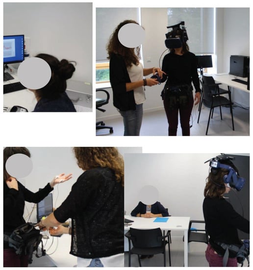 Photographs of the virtual experiment in the laboratory of Nantes. Each participant was immersed in a virtual reality environment providing visual and auditory feedback.