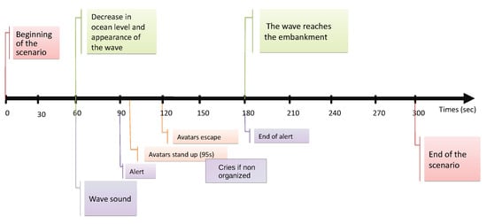 Process of the tsunami scenario over time: in green, progression of the wave due to the tsunami; in purple, the sounds heard by the survey respondents participating in the virtual reality experiment; in orange, the avatars action; in red, the beginning and the end of the actions.