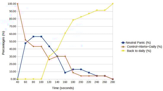 Based on knowledge in psychology and physiology, alert and control behaviors correspond to a basic state in which persons have a low heart rate (HR) contrary to the panic behavior (see Section 2 and []). During the VR experiments, two sets of measurements distinguished from the cardiac measurements were associated with a low HR or a high HR. Therefore, we consider that the first set of measurements correspond to everyday, alert and control behaviors in the APC model and the second set to the panic behavior. Persons returning to everyday life in the mathematical model can be identified by persons moving to safety in le vieux Nice or finishing the simulation. Their percentage during the experiment time corresponds to the difference between the total number of survey respondents and the number of control and panic respondents.
