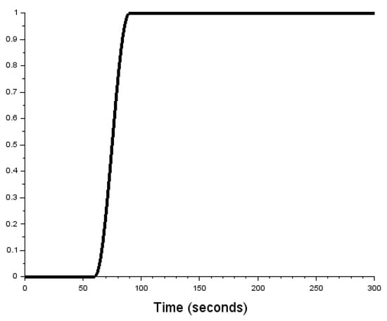 From Figure 5 and Table 2, a simple representation of functions and can be found. In the scenario of the VR experiment, the survey respondents are supposed to be engaged in an everyday behavior until the 60 s point, the moment at which the beginning of the wave can be heard. Thus, that models the catastrophe is supposed to be equal to 0 up to 60 s. Then, at 90 s, when the siren sounds, we suppose that all the persons become aware of the imminent arrival of danger. Consequently, 100% of survey respondents have adopted in one of the three behaviors: alert, control or panic behavior. Between 60 and 90 s, we assume that the percentage of people aware that a disaster is regularly increasing. Using the function