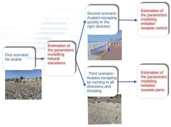 This section describes the strategy implemented to estimate the parameters from the set of measurements provided in Table 2. Two strategies are possible. The first is to follow the three VR scenarios and estimate first the intrinsic parameters and then, from their knowledge, estimate the imitation processes in the organized and non-organized scenario. A second possible strategy is to estimate all the parameters from the two scenarios integrating imitation processes (organized and non-organized scenarios) without any knowledge of the intrinsic parameters.