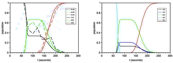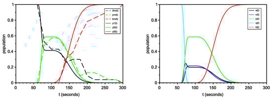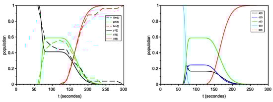 The left subplot of Figure 9 represents the trajectories of the real data , , , and the trajectories of the outputs calculated with the estimated parameters. In the right subplot, the curves represent the simulations of a, p, c, b, q.