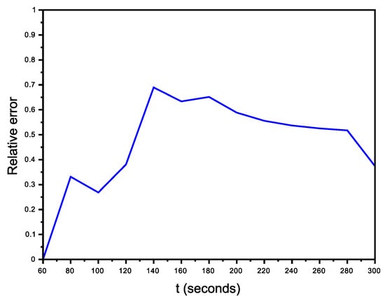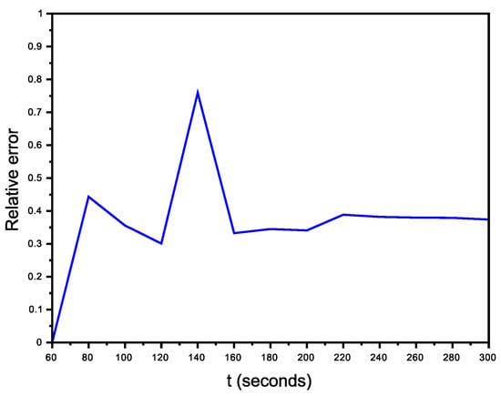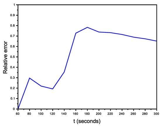 Representation of the relative error with respect to time. It corresponds to the sum of the relative errors between , , and , , , respectively. We note a deterioration of the results after 120 s but the relative error stabilizes and even decreases when considering a longer time.
