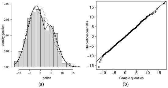 Clearly, the values taken by the asymmetry and kurtosis coefficients indicate that an asymmetric model may be more adequate than a symmetric model for fitting the pollen data. Moreover, the data histogram presented in Figure 5a shows that a model with the ability to fit bimodal data may present better results than just the PN model. To quantify the findings we test the hypothesis