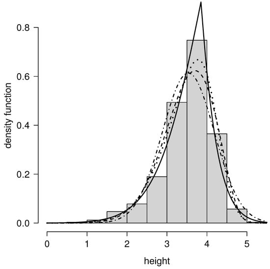 The first dataset corresponds to 481 observations of the variable “Crack” included in the dataset verb “Pollen5.Dat” available at http://lib.stat.cmu.edu/datasets/pollen.data, accessed on 15 October 2021. A descriptive summary of the data can be found in Table 3. Quantities and denote, respectively, the sample asymmetry and kurtosis coefficients.