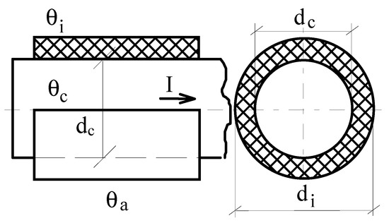 where θc, θi are the temperatures in the volume of the conductor, respectively of the insulation, and dc, di- the diameters of the current path (Figure 1).