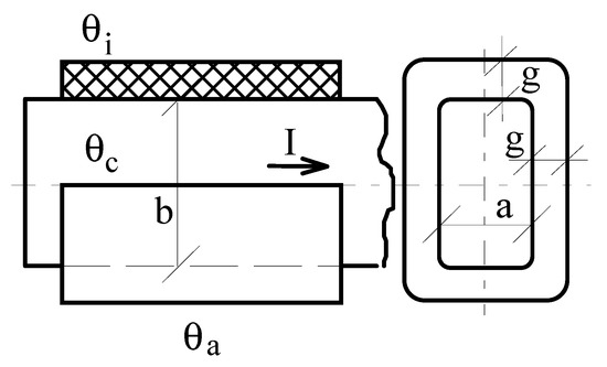 For the current path rectangular cross-section, the calculation of the permanent regime temperature is performed in the simplifying hypotheses according to which it is constant in the volume of the conductor, and on the current path outer surface being considered constants the density of the heat exchange thermal flow, respectively the global thermal transmissivity. On either of the two perpendicular directions of heat transmission by conduction in the insulating layer, the Equation (20) is written as: