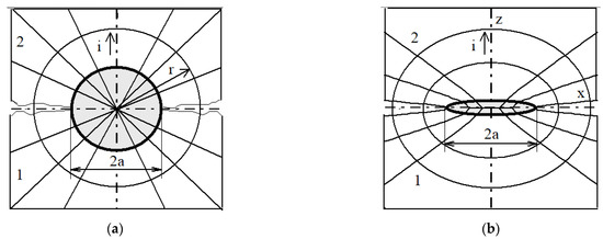 According to the sphere of infinite conductivity model, it is considered that between two metal parts 1, 2, (Figure 4a), having the resistivity ρ ≠ 0, the elementary electrical contact is made by means of a sphere, having the radius a and the resistivity is null. In these conditions, in the contact place area, the current lines are radial, and the equipotential surfaces are spheres, concentric with the contact sphere.