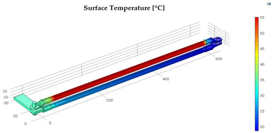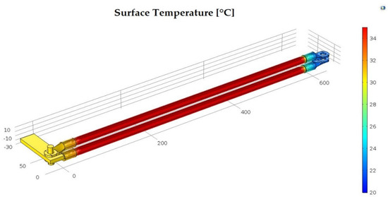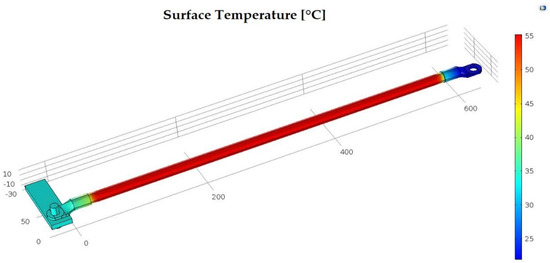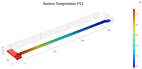 Between the temperature value recorded by the thermal imaging camera at the connecting area, point Sp1, of 33.9 [°C] and the one obtained by simulation of 34.1 [°C], a difference of 0.2 [°C] is noted (Figure 13 and Figure 17).