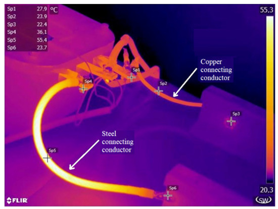 Analyzing Figure 16, it is observed that the temperature in the contact area, point Sp1, is 31.1 [°C], lower than the temperature on the steel conductors, points Sp2 and Sp3, which has values of approx. 33.5 [°C]. The experimentally recorded temperature distribution approaches the resulting values from the simulation of case 3, (which was 31.2 [°C] according to Figure 12).